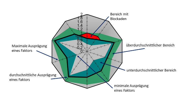 Mittels Fragebogen wurden die Ausprägungen der Innovationsfaktoren ermittelt und sind pro Ebene mit einem Radardiagramm graphisch dargestellt.