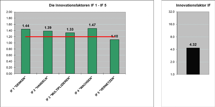 Mittels Fragebogen wurden die Ausprägungen der Innovationsfaktoren ermittelt und pro Ebene mit einem Radardiagramm graphisch dargestellt. Pro Ebene werden auch die Innovationsfaktoren IF1 bis IF3/IF5 berechnet, welche miteinander multipliziert den Innovationsfaktor IF(POP/POI) ergeben.